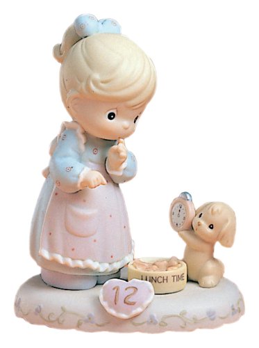 - Precious Moments age 12 girl with puppy showing a clock letting her know it's lunch time figurine